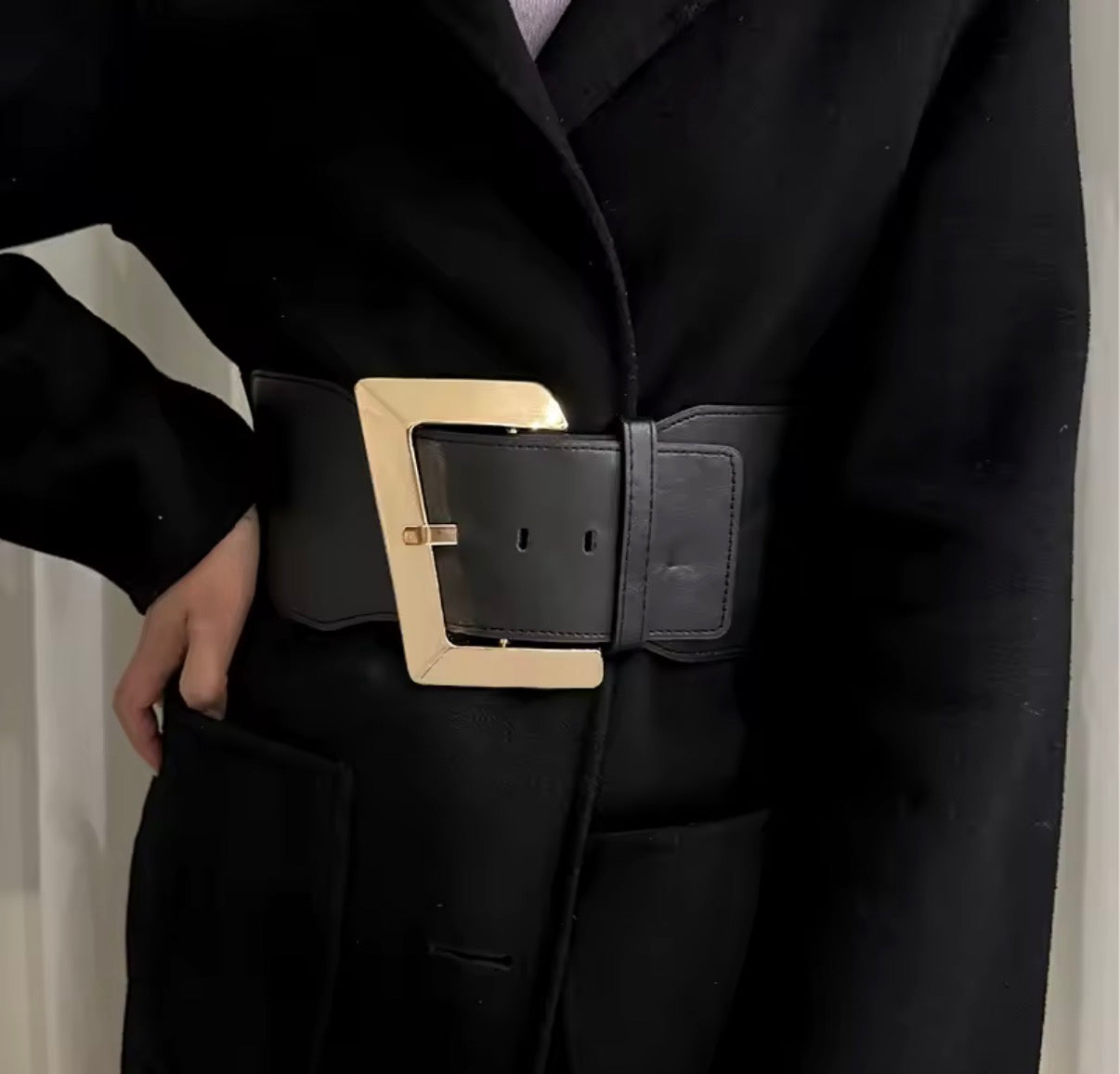 Il design ampio avvolge la vita creando un effetto strutturato ed elegante, mentre la grande fibbia geometrica color oro diventa il vero elemento protagonista, donando carattere e personalità anche agli outfit più minimal.