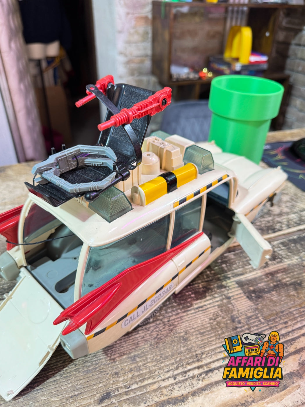 La macchina presenta i dettagli originali dell’epoca: portellone posteriore apribile, sedili per gli Acchiappafantasmi e accessori come il portafantasma e il gancio retrattile per catturare gli spettri.